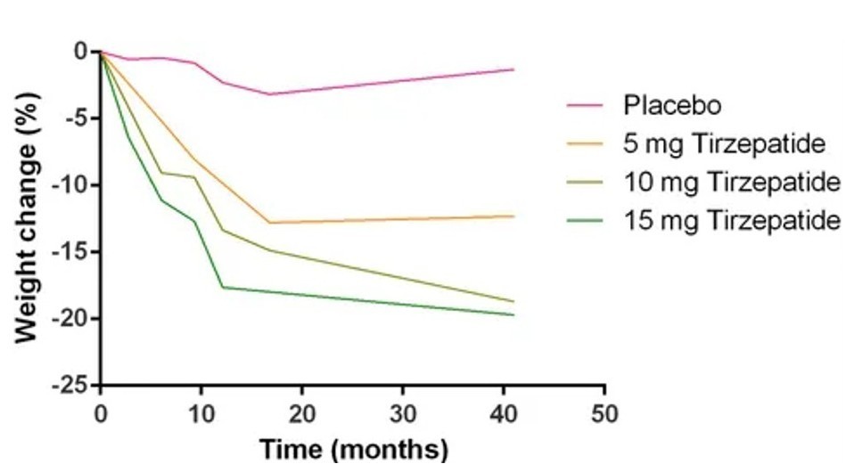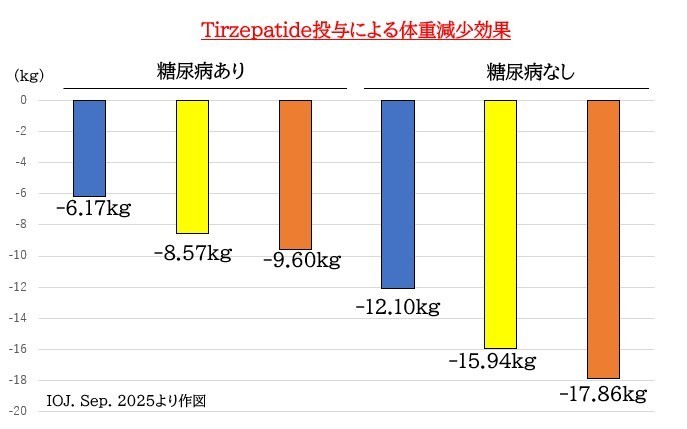 下図に示すように、チルゼパチドは用量依存性に強い減量効果を示していました。